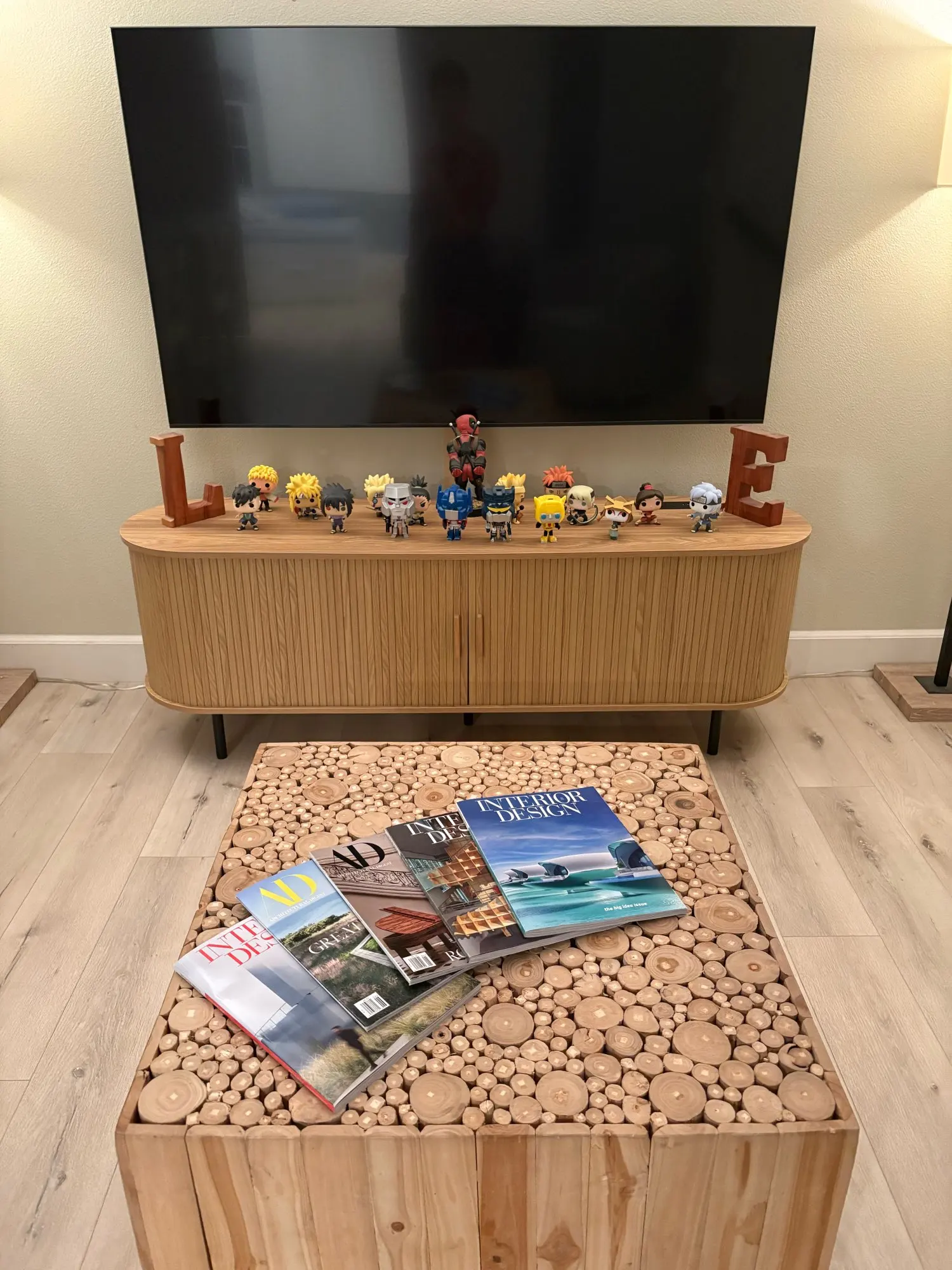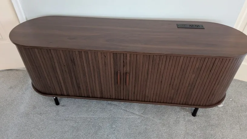 Elegant Fluted Design: This TV stand showcases a captivating slatted roller shutter sliding door design, perfectly paired with a sleek curved profile. The elegant tambour doors not only enhance the aesthetic appeal but also allow for seamless access to your media devices while adding a modern touch to any living space.